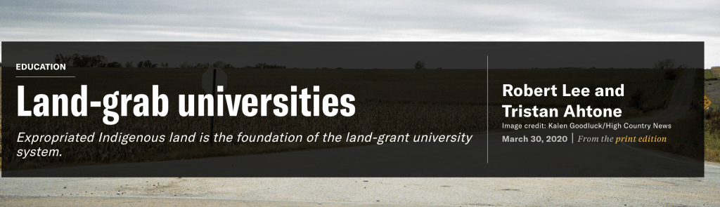 How have the land-grant universities who profited most from grabbed land done in terms of educating Native and Indigenous students? Not well, according to Feir and Jones, “Repaying a Debt? The Performance of Morrill Act University Beneficiaries as Measured by Native Enrollment and Graduation Rates.” Native American and Indigenous Studies, vol. 8 no. 1, 2021, p. 129-138. Project MUSE muse.jhu.edu/article/784825.