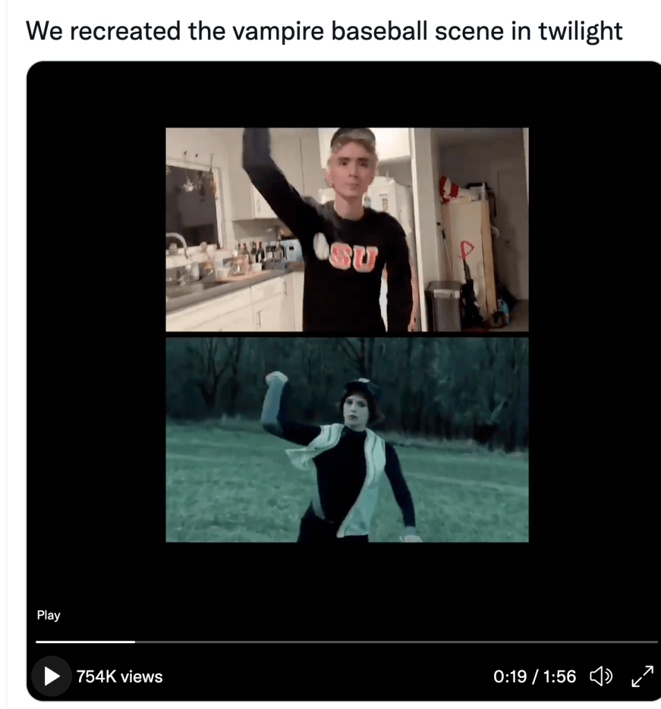 In the wake of unprecedented social disruption and widespread disease, Twilight’s reinvigorated fans found something meaningful about the Cullens’ particular brand of melancholy immortality. Consider a video initially posted on November 2, 2020 by Twitter user Richelle Chen (@yard_sard) which features Chen and several of her friends re-enacting Twilight (2008)’s Vampire Baseball sequence beat for beat. Instead of a forest outside Forks, Washington, this game takes place in someone’s cramped apartment, shot on an iPhone camera and using brooms and miniature pumpkins in place of bats and balls. Chen published the video alongside a clip of the original scene from Hardwicke’s film, a gesture which presents Chen’s video as an impressive exercise in both replication and adaptation. This framing offers a direct visual equation between Chen’s isolated friends and the immortal Cullens, and with this visual equivalency comes an emotional one that is unsettlingly apt.