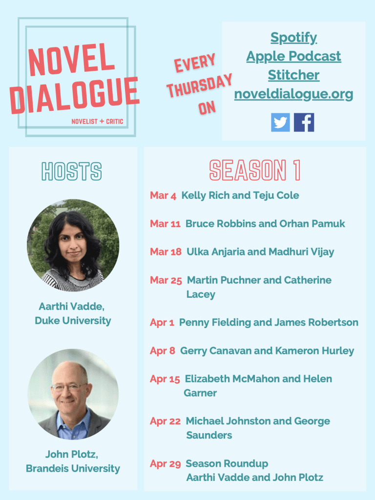 Crossover Month continues with something completely different, and only a little bit incestuous. Novel Dialogue is a new podcast hosted by the awesome Aarthi Vadde of Duke, and RTB’s own JP. John and Aarthi serve as the third wheel (or if you prefer the social lubricant) for a scholar and a novelist who sit down each week to explore the making of novels, and what to make of them. If you like what you hear, please share the love by recommending it to friends, tagging @noveldialogue in your tweets, and subscribing to it via Apple Podcasts Spotify or Stitcher