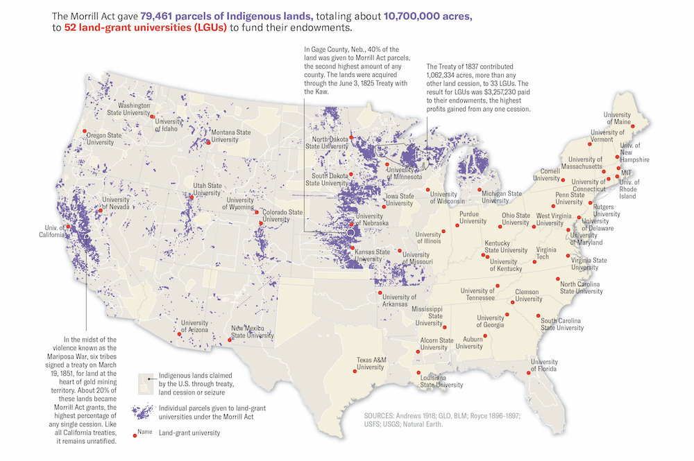 The episode unfolds from Robert Lee and Tristan Athone’s project, “Land-Grab Universities,” a High Country News investigation into how the United States funded land-grant universities with expropriated Indigenous Land. He explains that under the Morrill Act of 1862, colleges were built across the U.S. to teach branches of learning related to agricultural and mechanic arts to foster agricultural production. States received parcels of land to build their colleges on but also received land beyond the campus grounds to lease and sell for fundraising efforts. But before these states could be given parcels of land to sell, the federal government violently seized lands from Indigenous people – nearly 11 million acres of land from 250 tribes, bands and communities.